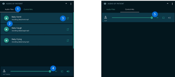 Like Audio to Room, Audio of Patient is an audio channel from the control room to the simulation room. Via this channel, the trainers in the control room can simulate the patient’s voice (tab Control Mic Patient) and play audio files (tab Audio Files) as patient sounds in the simulation room. Both audio sources are played through a loudspeaker near the patient in the simulation room.