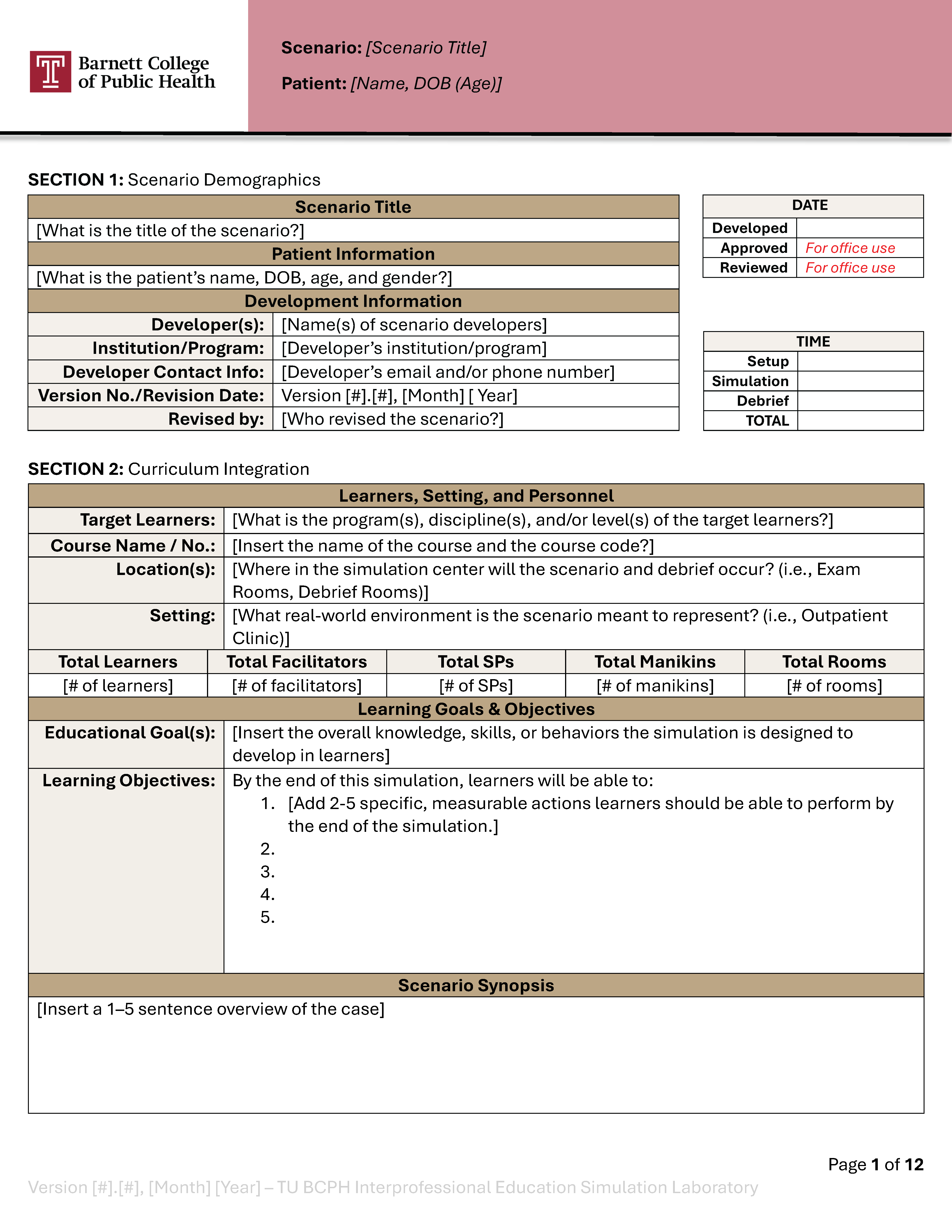 This section captures the administrative and identifying information for your scenario: the title, patient demographics, development team, version number, and estimated timing for setup, simulation, and debrief. The date fields for Approved and Reviewed are for Simulation Lab office use and will be completed by staff.