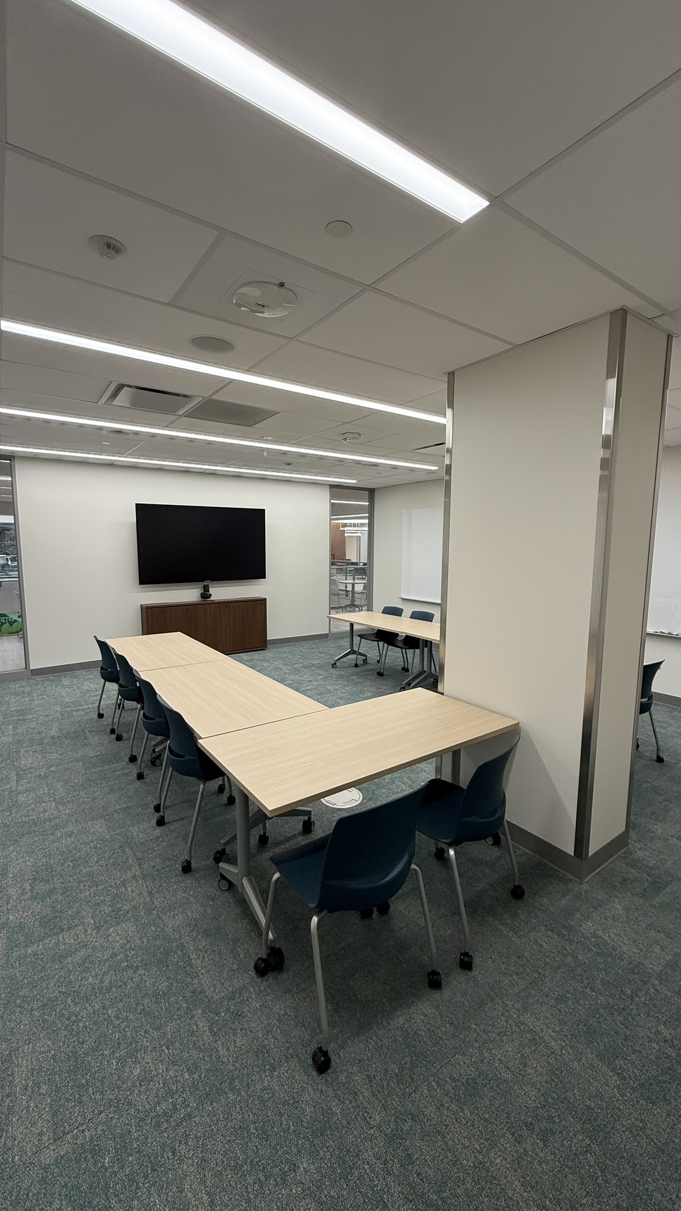 The environment in a debrief room is different from the simulation space itself. Seating is arranged to encourage conversation and eye contact rather than clinical activity. Each room includes audio-visual capabilities with 98" displays so participants can review simulation recordings when needed. Whiteboards and digital displays are available to capture key discussion points and themes that emerge during reflection.